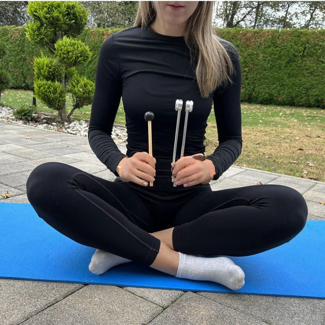 Uderz w Kamerton Leczniczy dołączonym aktywatorem lub o dłoń (nigdy o twarde powierzchnie). Przyłóż trzonek do napiętych mięśni lub stawów na 30 sekund do 3 minut.
